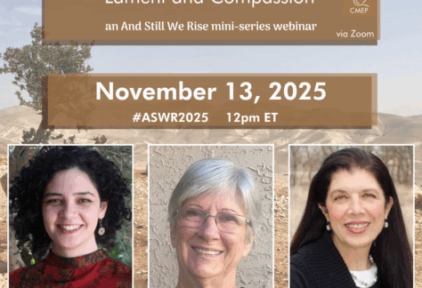 Watch the kickoff our countdown to And Still We Rise 2024. And Still We Rise (ASWR) seeks to elevate the voices and contributions of Palestinian women working to build peace in their homes, communities, and the world, while also creating opportunities for meaningful exchange between Palestinian and American women. This webinar, designed to introduce this project, its history, and its mission, features remarks from CMEP executive director, Rev. Dr. Mae Elise Cannon, And Still We Rise Coordinator Tamar Haddad, and ASWR Leadership Team Member, Shireen Awwad Hilal from Bethlehem Bible College.