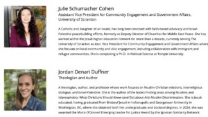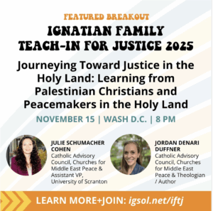 Too many trips to the Holy Land miss the unjust realities of life under Israeli occupation and ignore the “living stones” – Palestinian Christians who are deeply rooted in the places we know well from ancient Bible stories including Bethlehem, Jerusalem and Nazareth. What would it be like to travel to Israel-Palestine today? What would we find? Whose stories would we hear? In this session, Julie Schumacher Cohen and Jordan Denari Duffner will take us on a journey into Israel-Palestine to help us understand the struggles and resilience of Palestinians and to walk with Israeli and Palestinian peacemakers who together seek a future ofequality and dignity for all. Sharing stories and photos from their own pilgrimages to the region, Julie and Jordan will also elevate the voices of Christians, Muslims, and Jews they’ve met. Both women are members of the Catholic Advisory Council of Churches for Middle East Peace, and were the co-authors of the 2024 “U.S. Catholic Sign-on Letter on Israel-Palestine.”